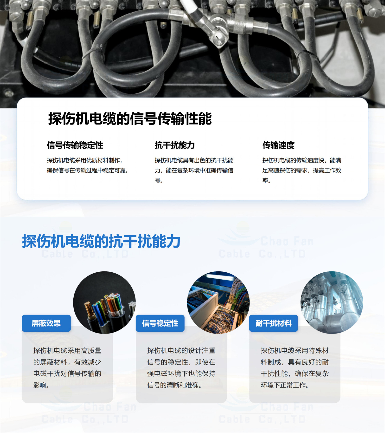 在探傷過程中,電纜需要頻繁地彎曲和移動,這就要求電纜必須具有良好的柔韌性和耐磨性。進(jìn)口聚氨酯護(hù)套可以滿足線纜來回移動的需求。內(nèi)部的麻繩填充可以使電纜保持圓整,在一定拉力下也不易斷裂。